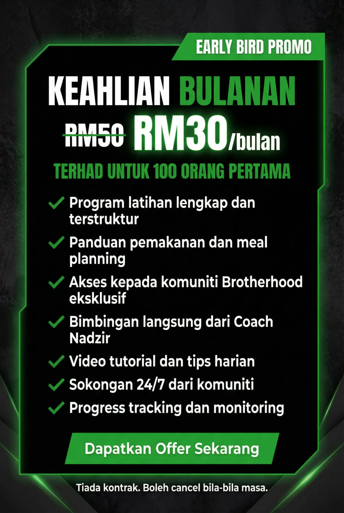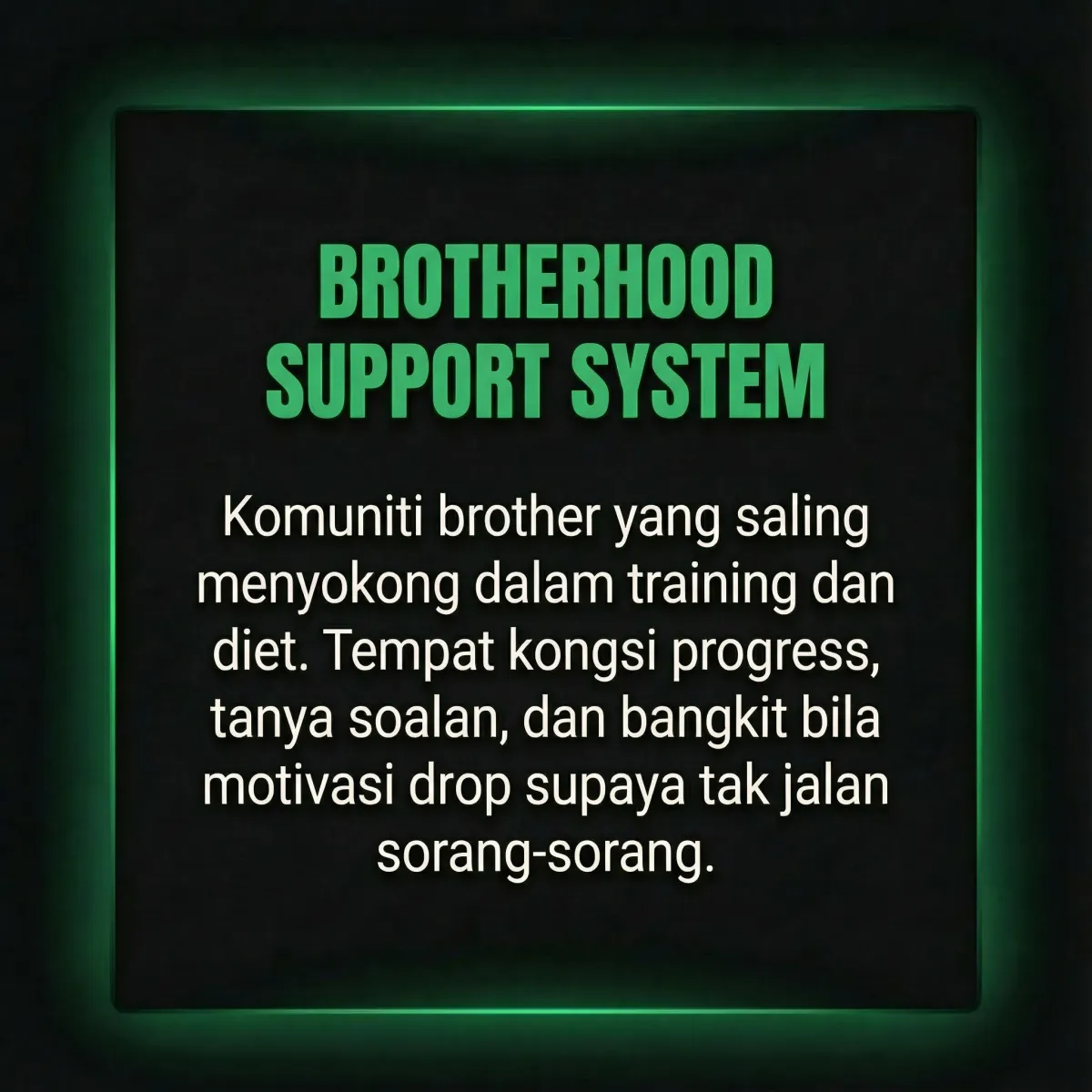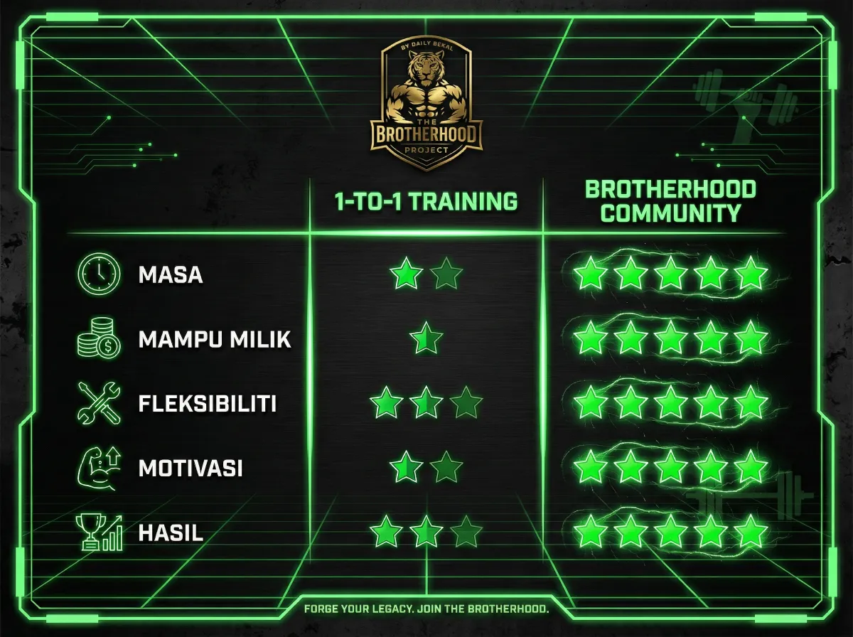 Saya membina Brotherhood Project untuk mengubah naratif ini. Misi saya bukan sekadar buat anda kurus, tapi untuk bina karakter lelaki yang kuat, dan ubah gaya hidup lelaki supaya